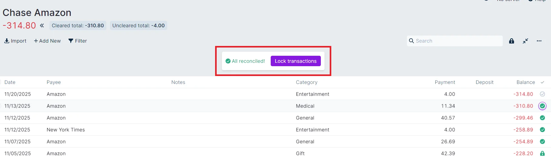 If you fail to click the Lock transactions button after the All reconciled! message appears, you will not change the status of the cleared transactions to locked.