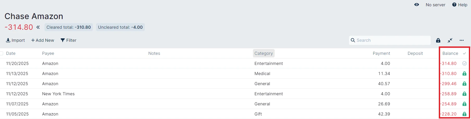 Click on the green balance in the header of the account view to bring two more category balances into view. The cleared total only includes transactions that have been matched to the bank while the Uncleared total shows the sum of the transactions that aren't yet matched to the bank statement.