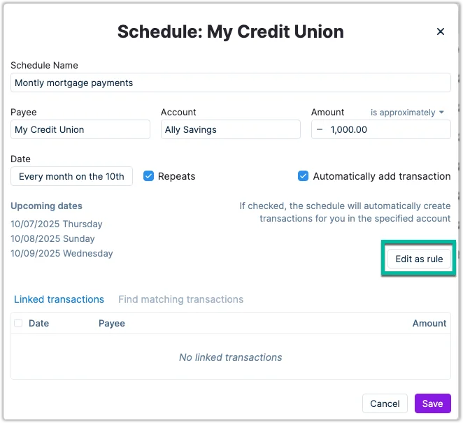 You can set schedules to recur on specific dates or frequencies and tailor them to fit your unique budgeting needs. Whether you're creating them from scratch or existing transactions, schedules can also be linked to rules to categorize and annotate entries automatically.